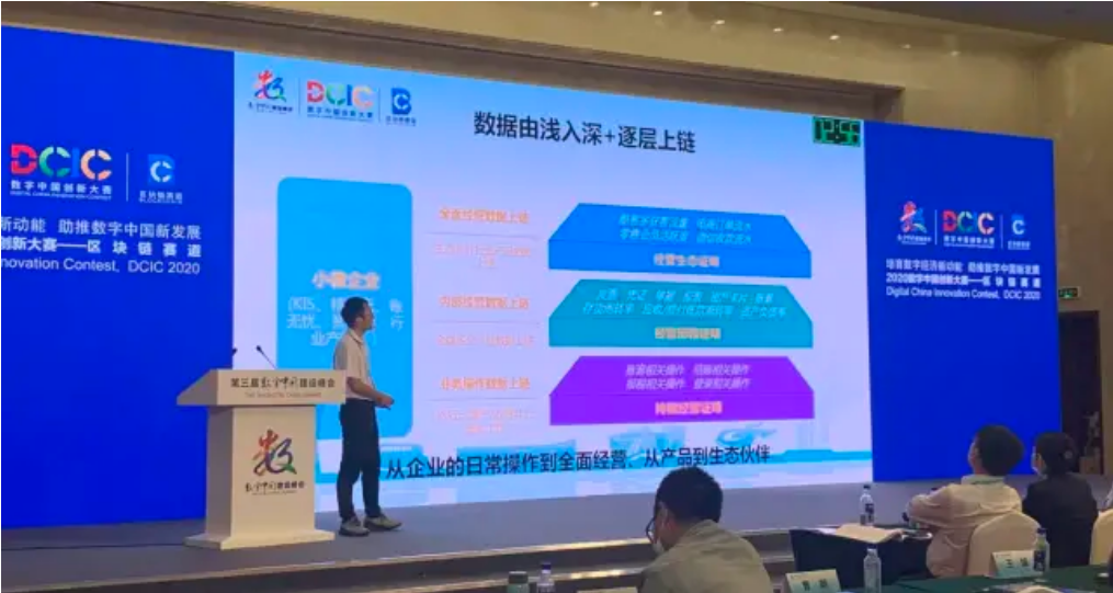 2020年10月13日,2020數(shù)字中國創(chuàng)新大賽總決賽在福州海峽國際會展中心成功舉辦。歷時5個月的賽事角逐,經過線上線下幾輪激烈比拼。最終,來自金蝶云蒼穹區(qū)塊鏈平臺的“金蝶信心鏈”項目榮獲區(qū)塊鏈賽道一等獎,成為本屆大賽“區(qū)塊鏈增信助力小微企業(yè)融資像網購一樣方便”賽最具創(chuàng)意和應用價值的區(qū)塊鏈項目。