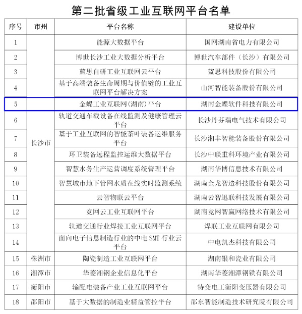為加快打造國(guó)家重要先進(jìn)制造業(yè)高地,推動(dòng)工業(yè)互聯(lián)網(wǎng)在更廣范圍、更深程度、更高水平上的融合創(chuàng)新,根據(jù)《湖南省省級(jí)工業(yè)互聯(lián)網(wǎng)平臺(tái)認(rèn)定管理辦法》(湘工信人工智能〔2020〕222號(hào)),經(jīng)企業(yè)申報(bào)、市州工信部門推薦、專家評(píng)審、現(xiàn)場(chǎng)核查、網(wǎng)上公示等程序,湖南省工業(yè)和信息化廳同意認(rèn)定金蝶工業(yè)互聯(lián)網(wǎng)(湖南)平臺(tái)等18個(gè)平臺(tái)為第二批省級(jí)工業(yè)互聯(lián)網(wǎng)平臺(tái)。
