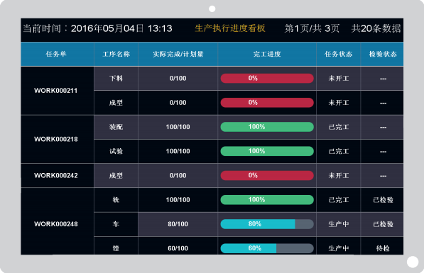 ●通過觸摸屏工作臺實現(xiàn)生產(chǎn)指令的即時下達、傳遞,任務(wù)/圖紙的即時查看、快速報工、檢驗等,實現(xiàn)生產(chǎn)過程數(shù)據(jù)信息化、即時化;
